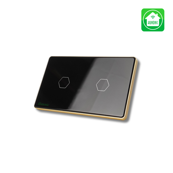 🎨 Thiết kế: Mặt kính cường lực cao cấp, khung viền vàng sang trọng, hình chữ nhật phù hợp thay thế công tắc truyền thống.